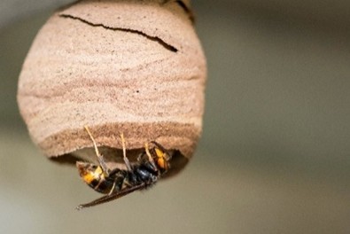 The Asian hornet builds three types of nests in a single year. Between March and May, after emerging from hibernation, the queen begins building a small embryonic nest about the size of an apple. These nests are often found in birdhouses, sheds, carports, and other sheltered locations.