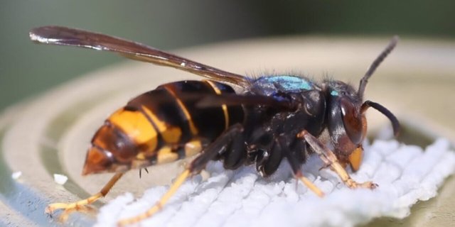 The Asian hornet—slightly smaller than the European hornet—can be recognized by its black thorax and abdomen, which feature a single broad yellow band, and its striking yellow legs.