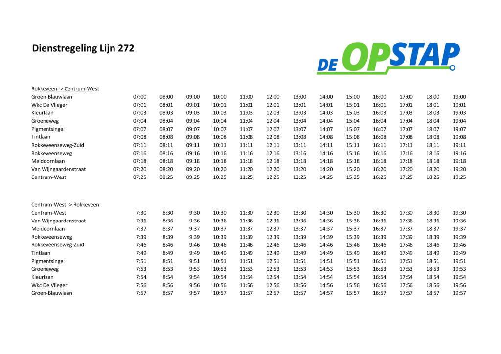 De Opstap runs from Monday to Friday from 7:00 a.m. to 8:00 p.m. and makes one trip per hour in each direction.