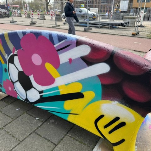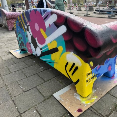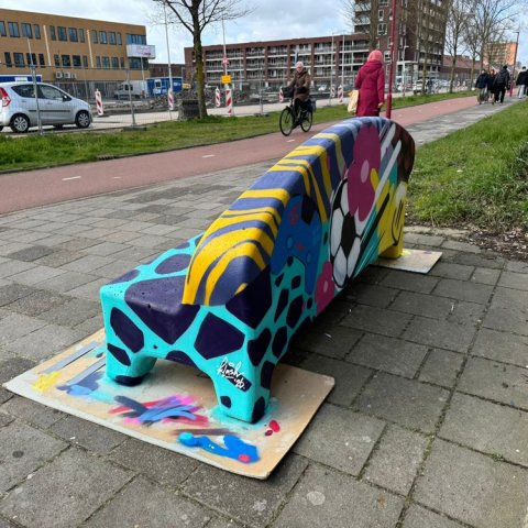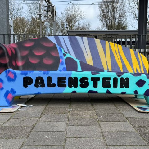 With the renovation of Palenstein, this bench couldn’t be left behind, of course. Time to strip away the four layers of old paint and give it a fresh new look! Artist Tobias from Urban Art Studio got to work, but not without some help. In fact, the 8th-grade class at IKC De Kasteeltuyn played a key role in the design.