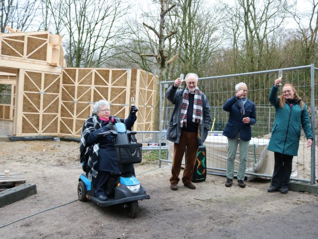 Under the watchful eye of Alderman Marijke van der Meer, the new Westpunt pavilion reached its highest point. Chairman Bert Pol of the Friends of Nature and Landscape Garden Foundation and Alderman Van der Meer raised a toast to the work, which is scheduled for completion in the summer of 2026.